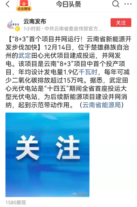 摘自云南省能源局發(fā)布的消息:【“8+3”首個項目并網(wǎng)運行!云南省新能源開發(fā)步伐加快】,2021年12月14日,位于楚雄彝族自治州的武定田心光伏項目建成投運,并網(wǎng)發(fā)電。該項目是云南“8+3”項目中首個投產(chǎn)項目,年均設(shè)計發(fā)電量1.9億千瓦時,每年可減少二氧化碳排放超過15萬噸。武定田心光伏電站是“十四五”期間全省首座投運大型光伏電站,為后續(xù)新能源項目建設(shè)并網(wǎng)消納,起到示范帶動作用。